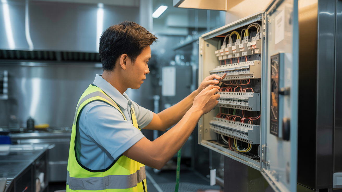 Electrical work in a restaurant is more than just sockets and lights. It involves power lines for commercial ovens, fryers and cold rooms, three-phase connections, UPS protection for POS and server equipment, emergency lighting to fire-safety codes, and proper earthing with leakage protection.